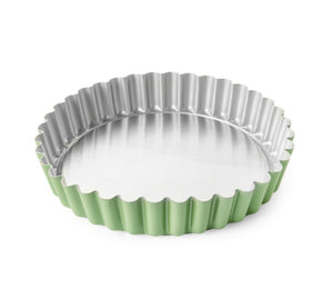 Make lovely tarts and quiches with a self-crimped edge. Removable bottom makes for easy release and serving. Comes in a mint exterior color with nonstick interior surface.