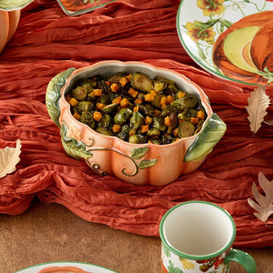 Bring the beauty of autumn to your table with the Harvest Fields 3D Pumpkin Shallow Serving Bowl, a stunning seasonal centerpiece that blends functionality with farmhouse charm. Featuring a sculpted pumpkin design with hand-painted vine and leaf details, this 10” x 7” ceramic serving bowl is perfect for serving side dishes, salads, roasted vegetables, stuffing, mashed potatoes, and more. The 32oz capacity provides ample space for fall favorites, while the shallow yet wide shape makes it ideal for easy serving and elegant food presentation. Crafted from durable ceramic with a smooth glazed finish, this bowl is microwave-safe for reheating and dishwasher-safe for hassle-free cleanup. Whether you’re hosting Thanksgiving, a fall dinner party, or simply adding festive elegance to your kitchen, this bowl is a seasonal must-have for serving in style.